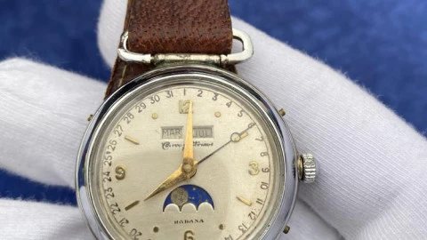 Cuervo y Sobrinos Triple Calendario con fase lunar en acero años 40.
